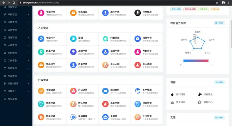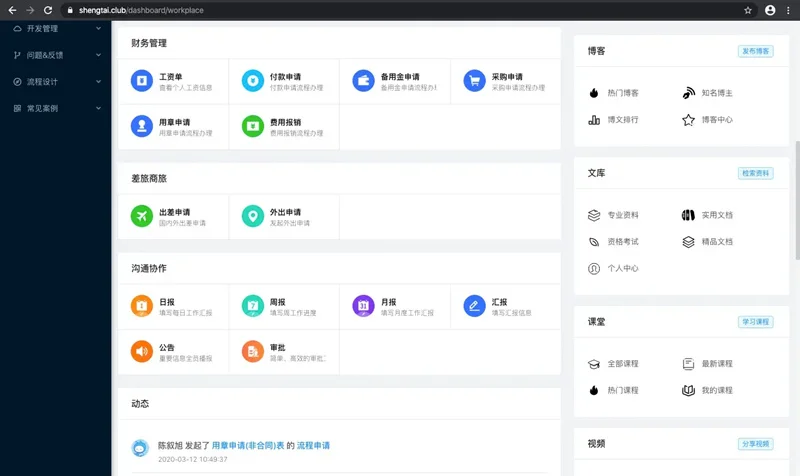 具有工作流动态审批、加签、会签等工作流功能,可以对工作流程的审批业务进行评论/讨论